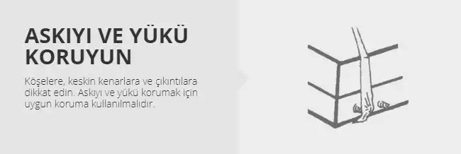Ürünü kullanırken, yükün bağlantı noktaları keskin ya da kesici olmamalıdır. Ürünün hammaddesi gereği keskin yerlerden korumalısınız. Eğer keskin ya da köşeli bir kenar var ise bunun için lütfen ek güvenlik aparatlarından talep ediniz.