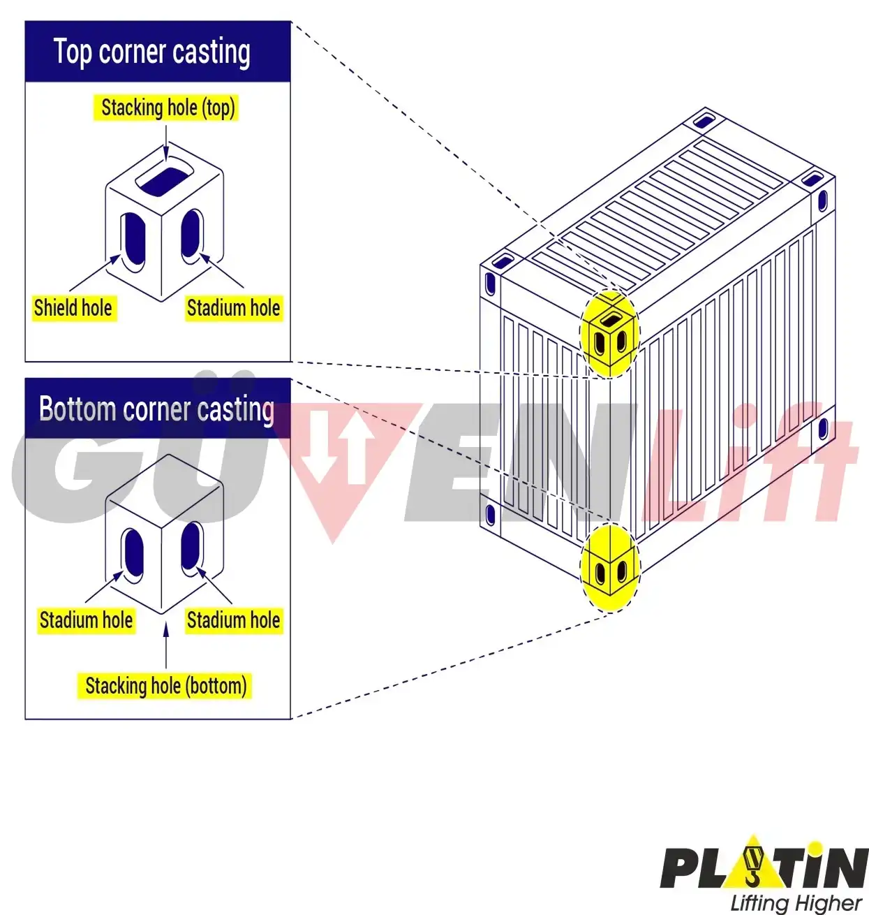 En belirgin fark, üst ve alt köşe dökümleri arasındadır. Alt dökümlerin iki yanında stadyum şeklinde iki delik (artı altta büyük bir istifleme deliği) bulunurken, üst dökümlerin yanlarında iki farklı şekilli delik ve üstte istifleme deliği bulunur. Üst dökümlerin, kabın uzun tarafında bir deliği ve kabın ön veya arka ucunda bir kalkan deliği vardır. Domino Kelepçelerinin hem kalkan ve hem de deliklerine uyduğunu, ancak üst dökümün üstündeki ve alt dökümlerin alt tarafındaki çok daha büyük istifleme deliklerine denk gelmesine dikkat etmek önemlidir.