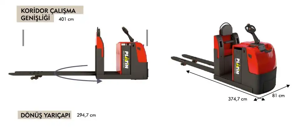 Güvenlik Özellikleri: Transpalet, güvenlik standartlarına uygun olarak tasarlanmıştır. Güvenli fren sistemi, acil durum stop düğmesi ve stabilite özellikleri, operatörün güvenli bir şekilde çalışmasını sağlar.